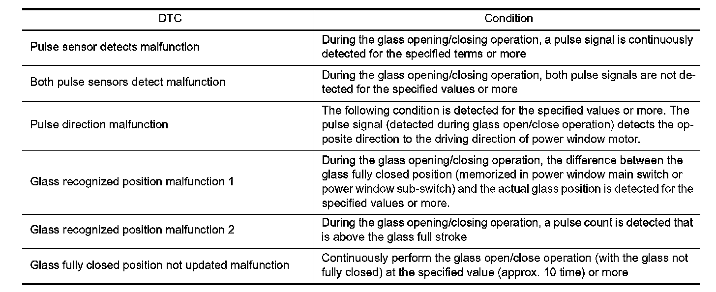 The encoder signal detects the up / down speed / detection of door glass. If the malfunction is detected to the encoder signal or the difference between the glass fully closed position (memorized in power window main switch or power window sub-switch) and the actual glass position is detected, it shifts into the fail-safe control