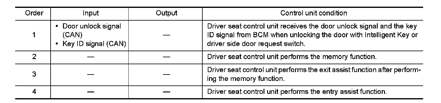 When unlocking doors by using Intelligent Key or driver side door request switch, the system performs memory operation, exiting operation then entry operation.