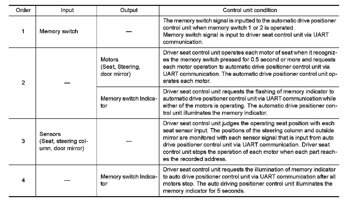 The driver seat control unit can store the optimum driving positions (seat, steering column and door mirror position) for 2 people. If the front seat position is changed, one-touch (pressing desired memory switch for more than 0.5 second) operation allows changing to the other driving position.
