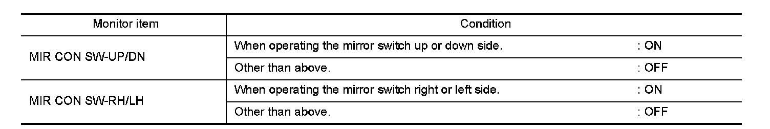 Check the operation on "MIR CON SW�UP/DN" and "MIR CON SW�RH/LH" in "DATA MONITOR" mode using CONSULT-III.