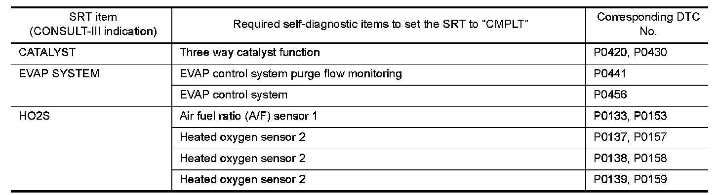 In order to set all SRTs, the self-diagnoses as in the "SRT ITEM" table must have been performed at least once. Each diagnosis may require actual driving for a long period of time under various conditions.