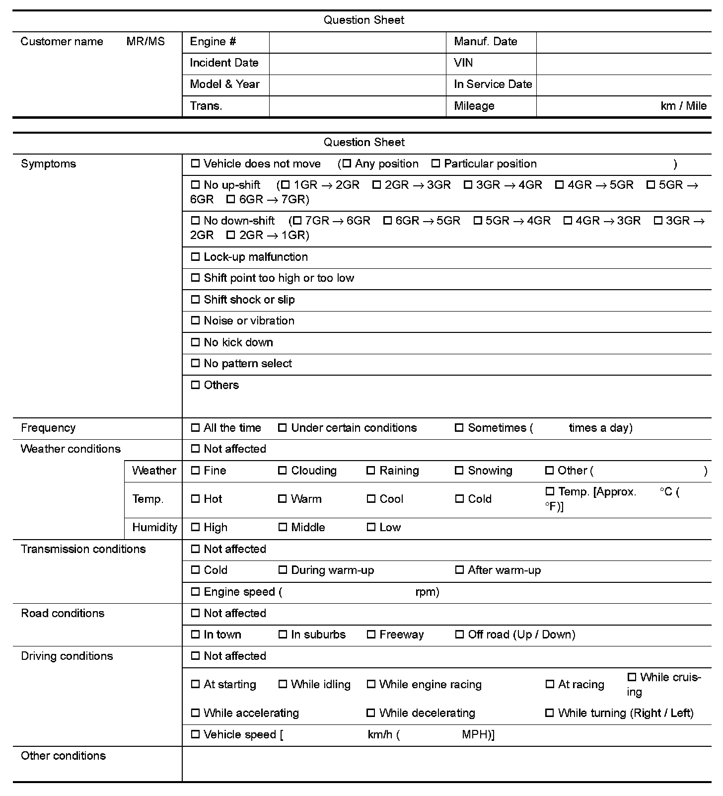In general, customers have their own criteria for a problem. Therefore, it is important to understand the symptom and status well enough by asking the customer about the concerns carefully. In order to systemize all the information for the diagnosis, prepare the question sheet referring to the question points.