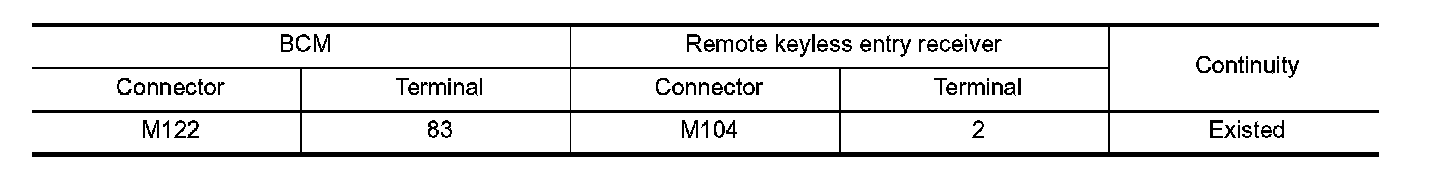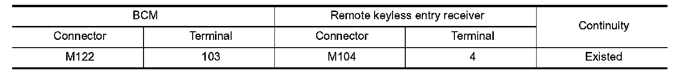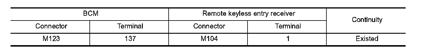 2. Check continuity between BCM harness connector and remote keyless entry receiver harness connector.