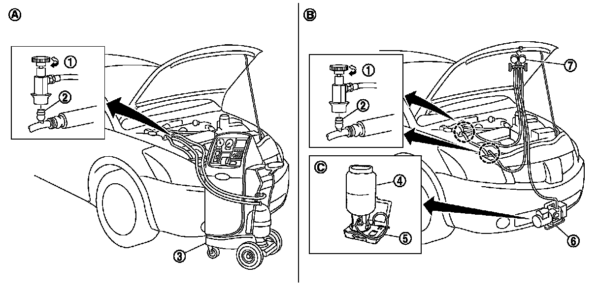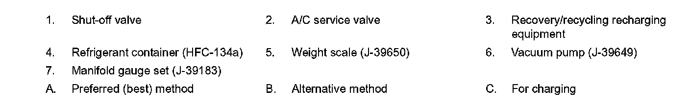 1. Connect recovery/recycling recharging equipment or manifold gauge set (SST: J-39183).