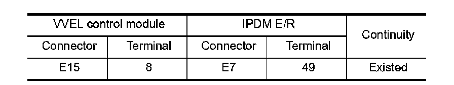 4. Check the continuity between VVEL control module harness connector and IPDM E/R harness connector.