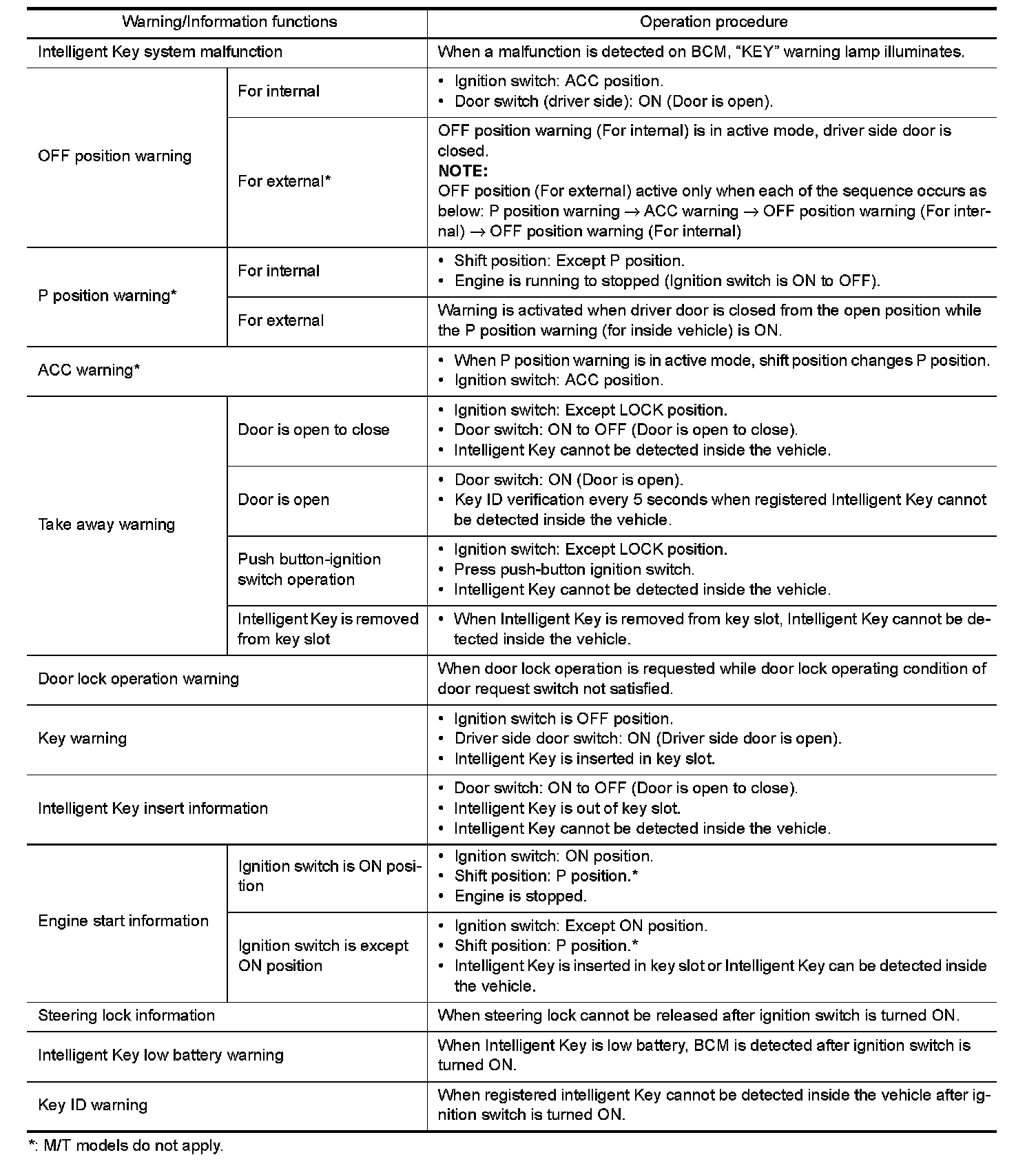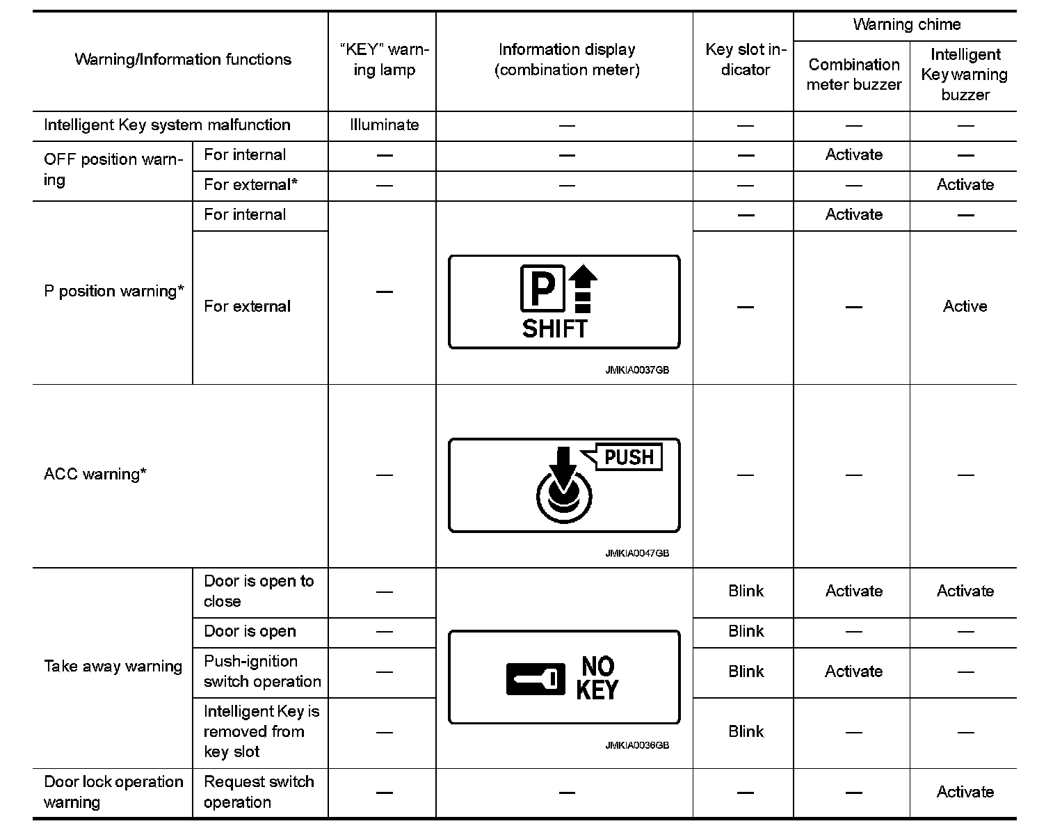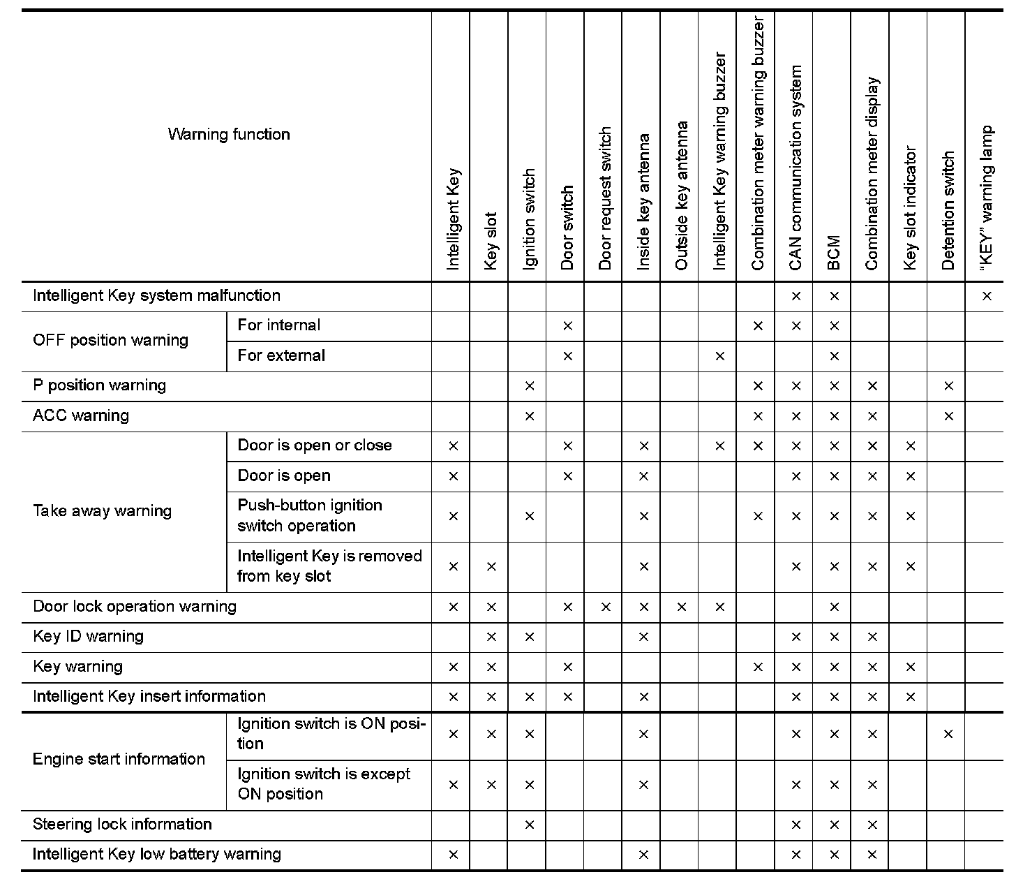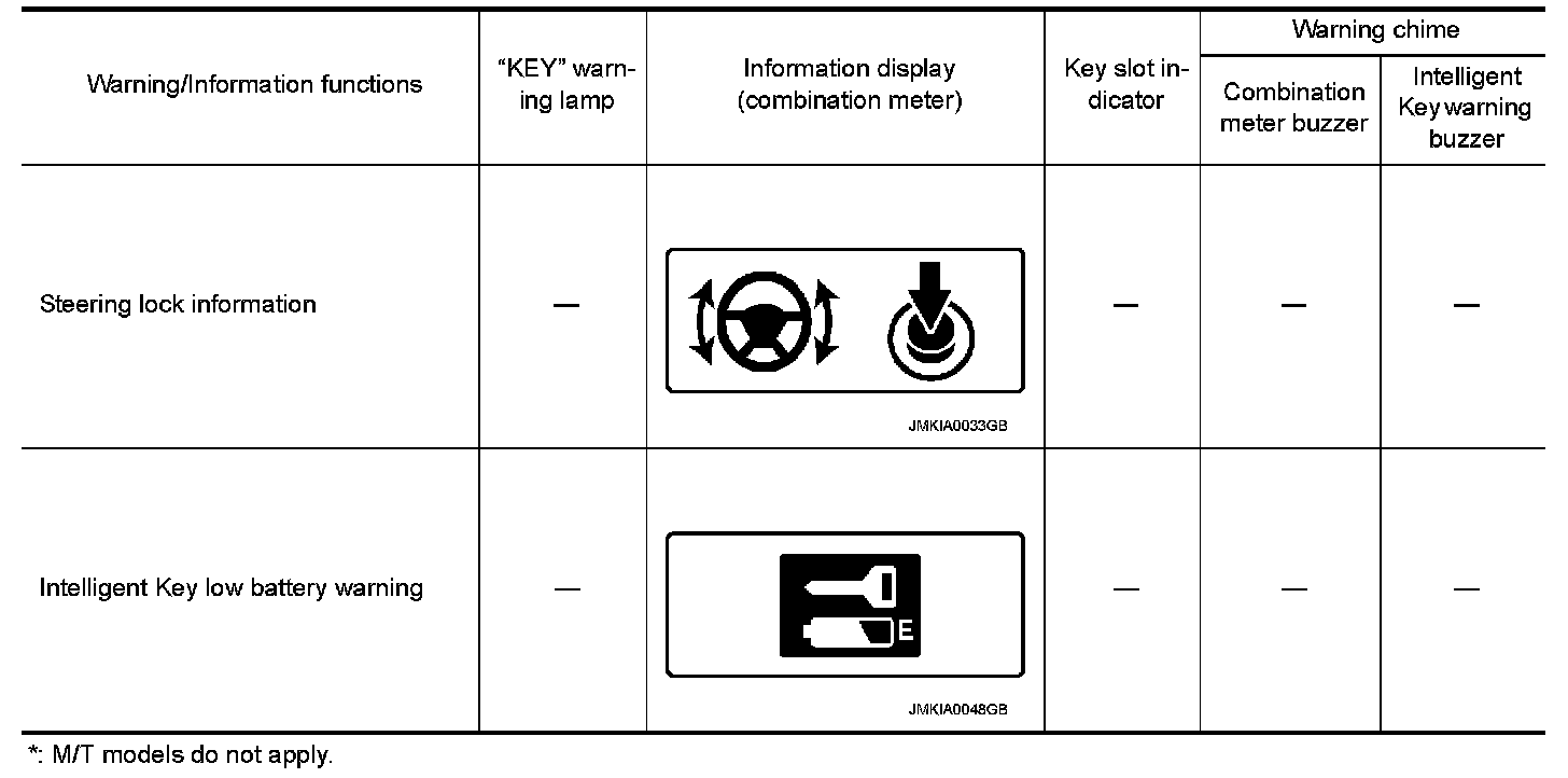 The warning function are as per the following items and are given to the user as warning information and warnings using combinations of Intelligent Key warning buzzer, KEY warning lamp, key slot indicator and information display in combination meter.