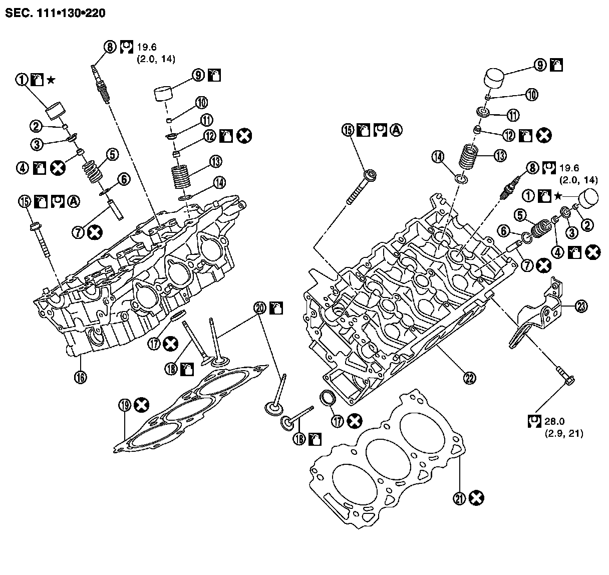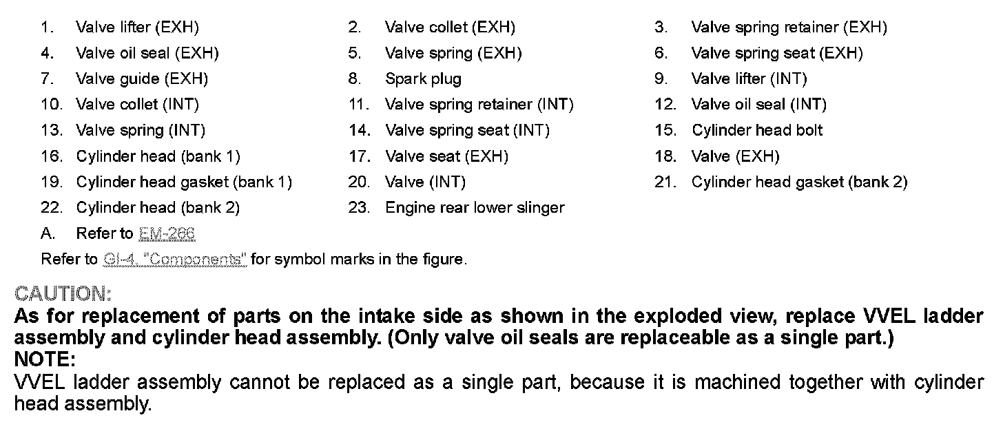 As for replacement of parts on the intake side as shown in the exploded view, replace VVEL ladder assembly and cylinder head assembly. (Only valve oil seals are replaceable as a single part.)
