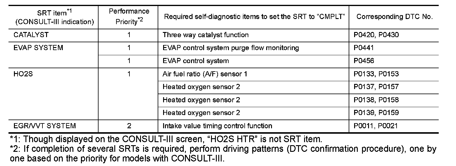 *2: If completion of several SRTs is required, perform driving patterns (DTC confirmation procedure), one by one based on the priority for models with CONSULT-III.