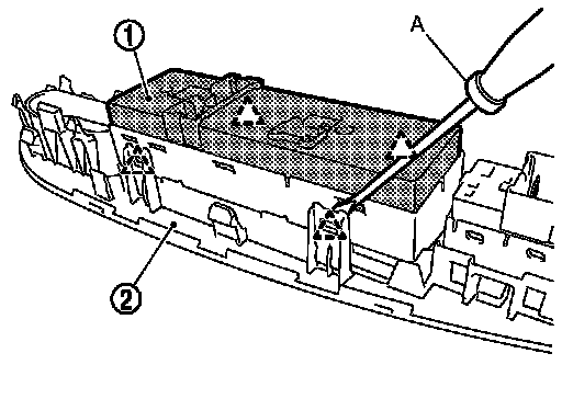 2. Power window main switch (1) is removed from power window main switch finisher (2) using flat-head screw driver (A) etc.