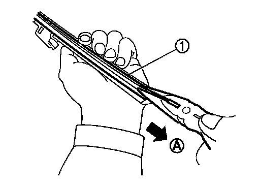 1. Hold the rip of old wiper refill (1) at the rear end of the wiper blade with long-nose pliers, and pull out the wiper refill to the direction (A).