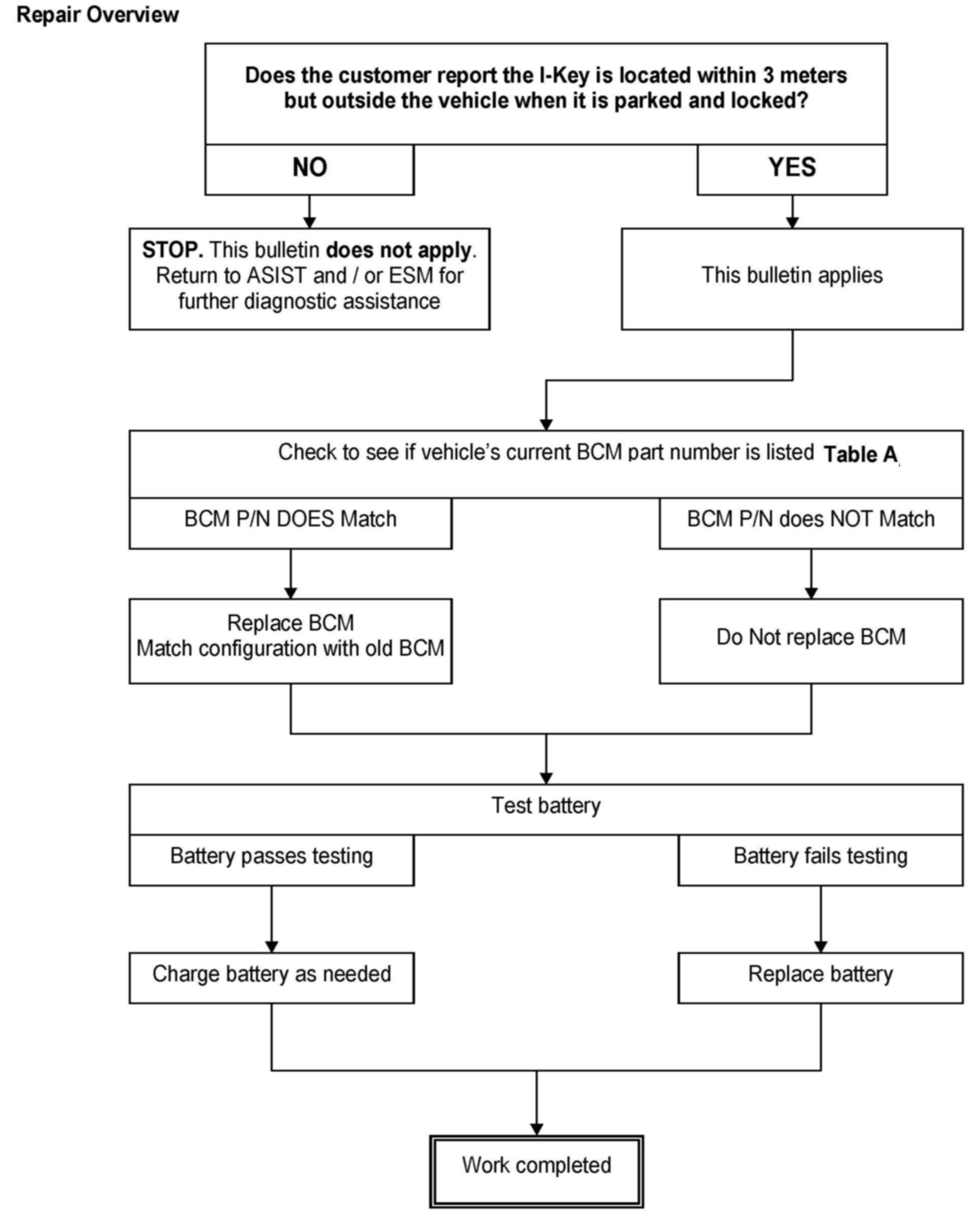 If the customer reports the I-Key is NOT within 3 meters (approximately 9.8 feet) when the vehicle is parked this bulletin DOES NOT APPLY. Go back to ASIST and / or the Electronic Service Manual (ESM) for further diagnostic and repair information.