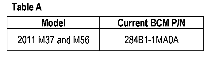 2. Compare the vehicle's BCM P/N to the P/N in the Current BCM P/N column in Table A below.