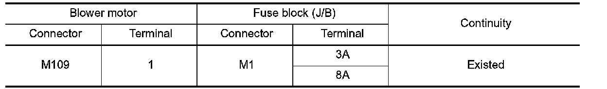 2. Check continuity between blower motor harness connector and fuse block (J/B) harness connector.