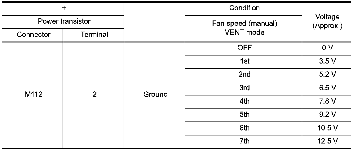 Change fan speed from 1 to 7, and check voltage between power transistor harness connector and ground.