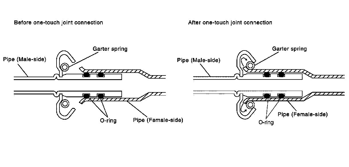 - Connecting point of pipe (female-side) is thin and easily deformed. Always insert pipe (male-side) in the axial direction straight and slowly. Be careful not to deform pipe (female-side).