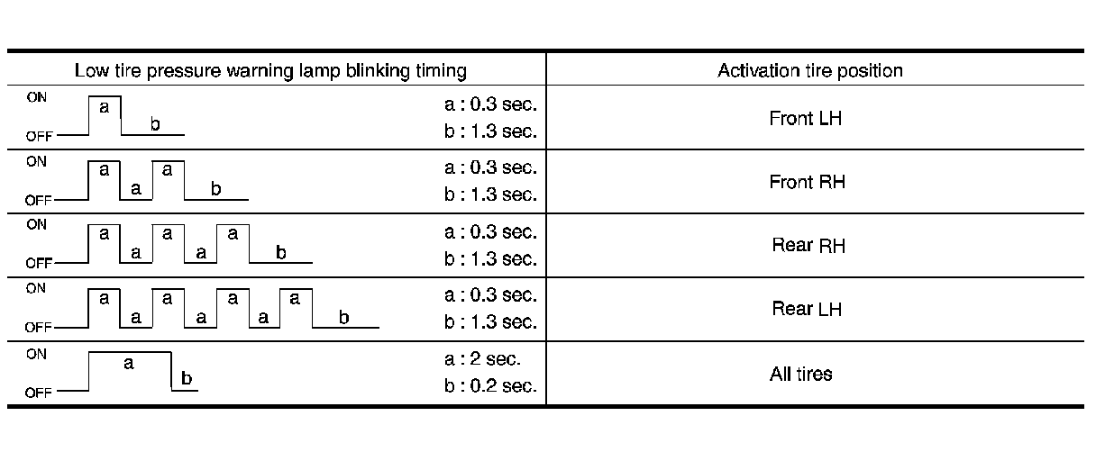 4. Check that the low tire pressure warning lamp blinks in the pattern shown as per the following. The pattern indicates that the transmitter wake-up procedure for the wheel is completed.