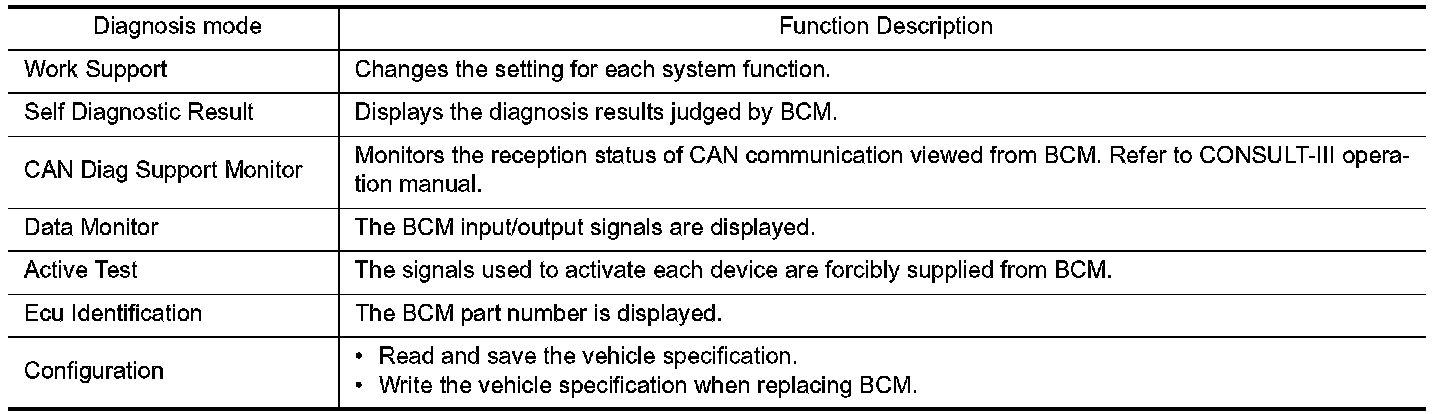 CONSULT-III performs the following functions via CAN communication with BCM.