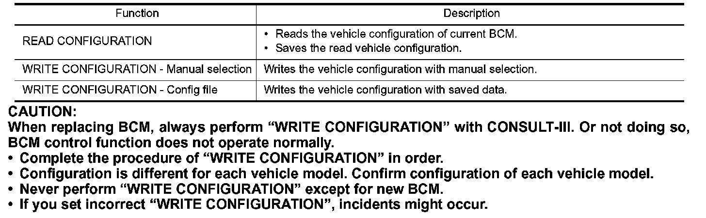 When replacing BCM, always perform "WRITE CONFIGURATION" with CONSULT-III. Or not doing so, BCM control function does not operate normally.