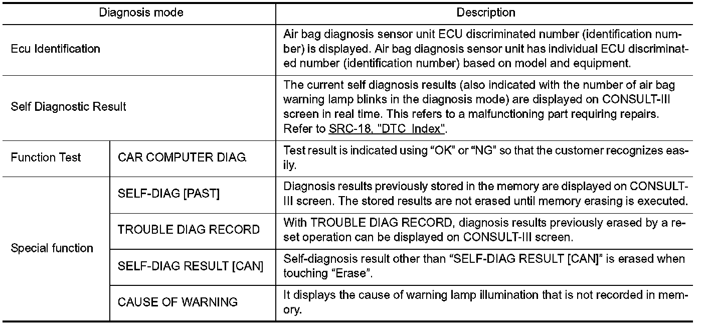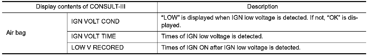 In such a case, the DTC memory is not performed and changing to the self-diagnostic mode by IGN operation cannot be performed while the air bag warning lamp illuminates. "NO DTC" is displayed even if the malfunctioning parts are checked by CONSULT-III.