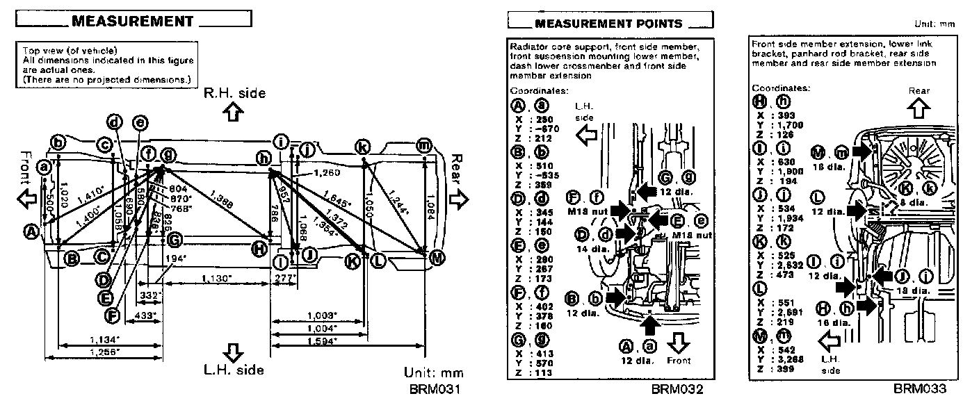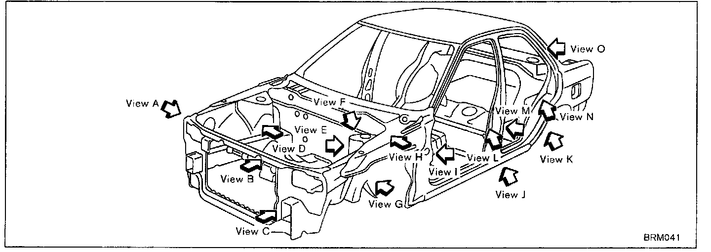 The Body Repair Manual published for each model includes body alignment drawings, body center marks and panel matching marks. These are used to measure the extent of damage done (deformation extent) and to make sure that the dimensions of the body are correct after making the repair.