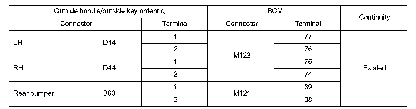 2.Check continuity between malfunctioning outside handle or outside key antenna harness connector and