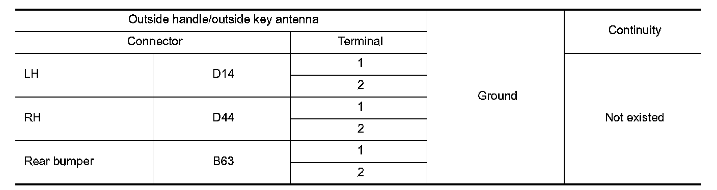 3.Check continuity between malfunctioning outside handle or outside key antenna harness connector and ground.