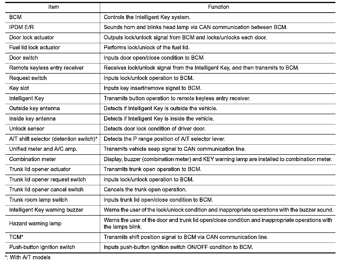 INTELLIGENT KEY SYSTEM : Component Description