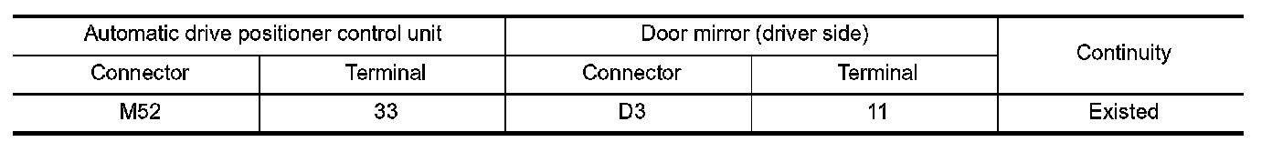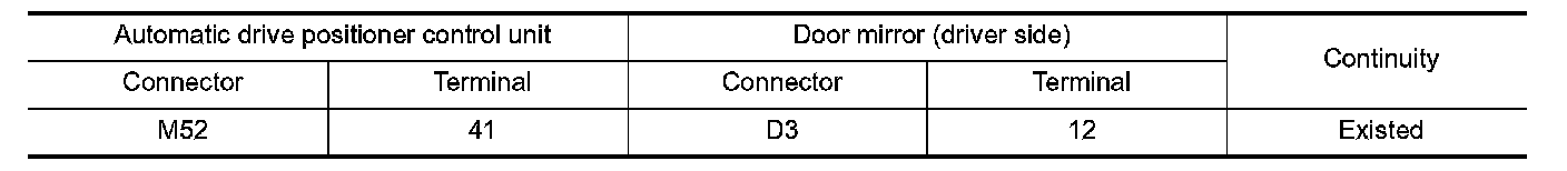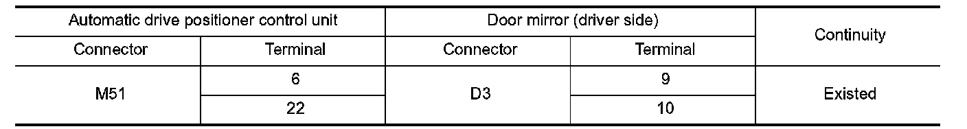 3.Check continuity between automatic drive positioner control unit harness connector and door mirror (driver side) harness connector.