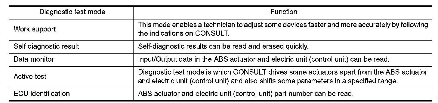 CONSULT can display each diagnostic item using the diagnostic test modes shown following.