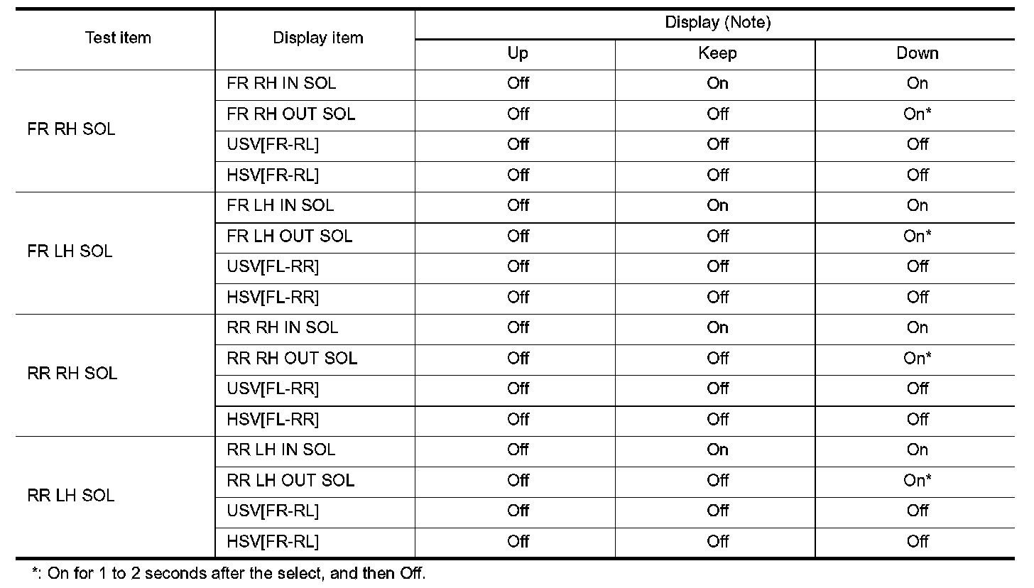 - Select "Up", "Keep" and "Down". Then use screen monitor to check that solenoid valve operates as shown in the table below.