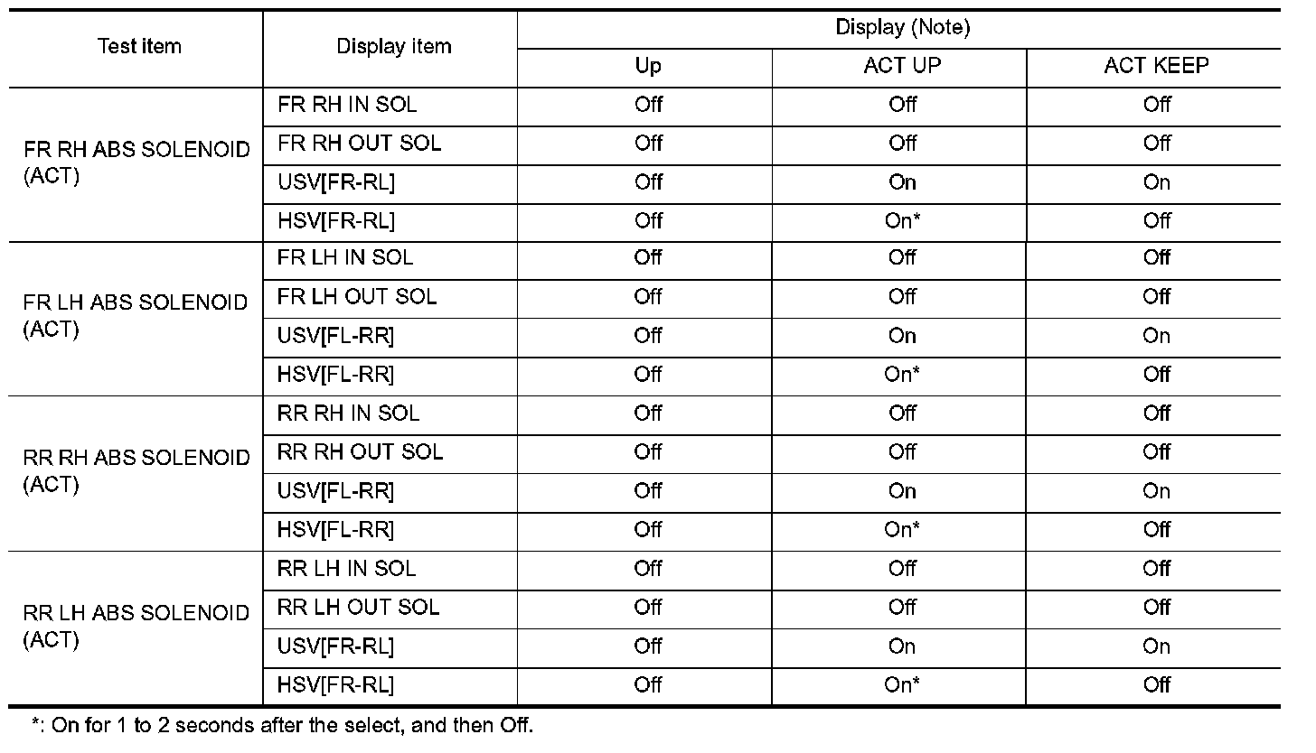 - Select "Up", "ACT UP" and "ACT KEEP". Then use screen monitor to check that solenoid valve operates as shown in the table below.
