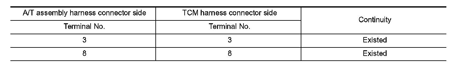 2.Check the continuity between the A/T assembly harness connector side and the TCM harness connector side of the joint connector.