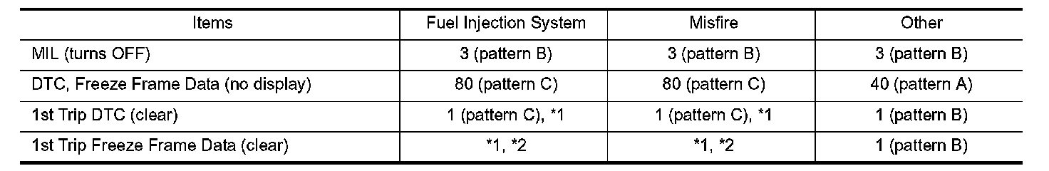 - The DTC and the freeze frame data will be stored until the vehicle is driven 40 times (driving pattern A) without the same malfunction recurring (except for Misfire and Fuel Injection System). For Misfire and Fuel Injection System, the DTC and freeze frame data will be stored until the vehicle is driven 80 times (driving pattern