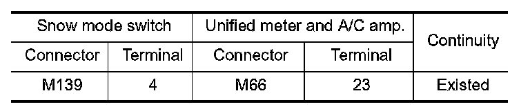 3.Check the continuity between snow mode switch harness connector and "unified meter and A/C amp."