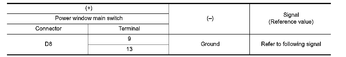 2.Check signal between power window main switch harness connector and ground with oscilloscope.