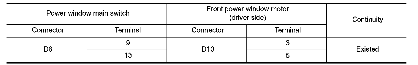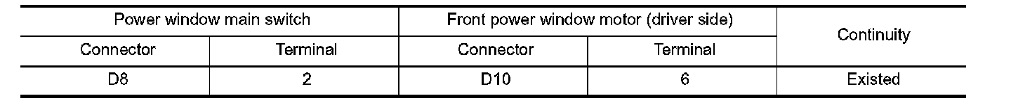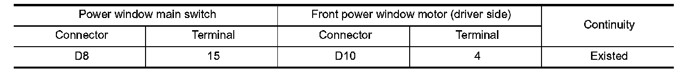 3.Check continuity between power window main switch harness connector and front power window motor (driver side) harness connector.