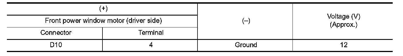 3.Check voltage between front power window motor (driver side) harness connector and ground.