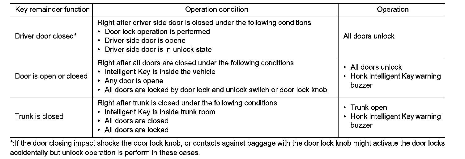 - The above function operates when the Intelligent Key is inside the vehicle. However, there may be times when the Intelligent Key cannot be detected, and this function does operate when the Intelligent Key is on the instrument panel, rear parcel shelf, or in the glove box. Also, this system sometimes does not operate if the Intelligent Key is in the door pocket for the open door.