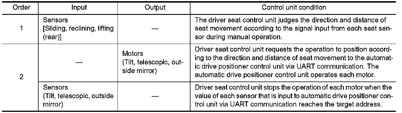 When performing the sliding, reclining or lifting (rear) operation in manual function, the driver seat control unit performs the seat synchronization function as follows.