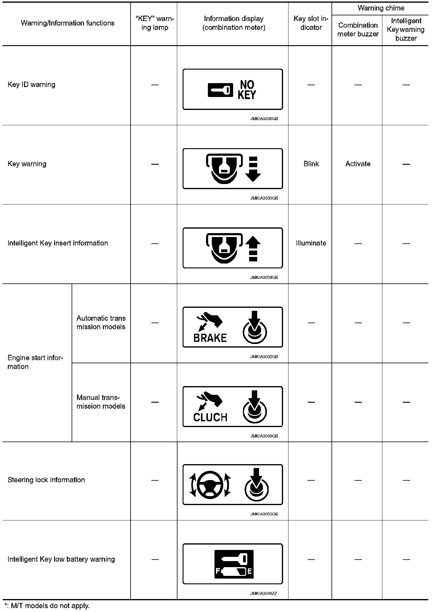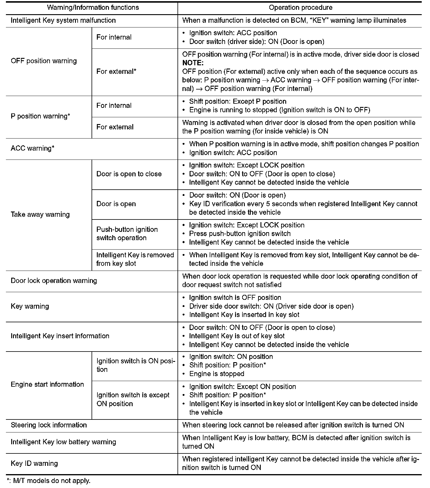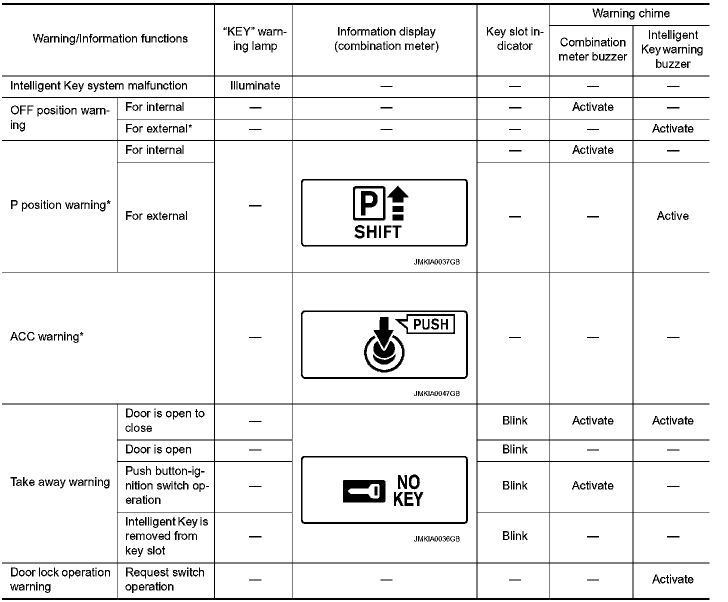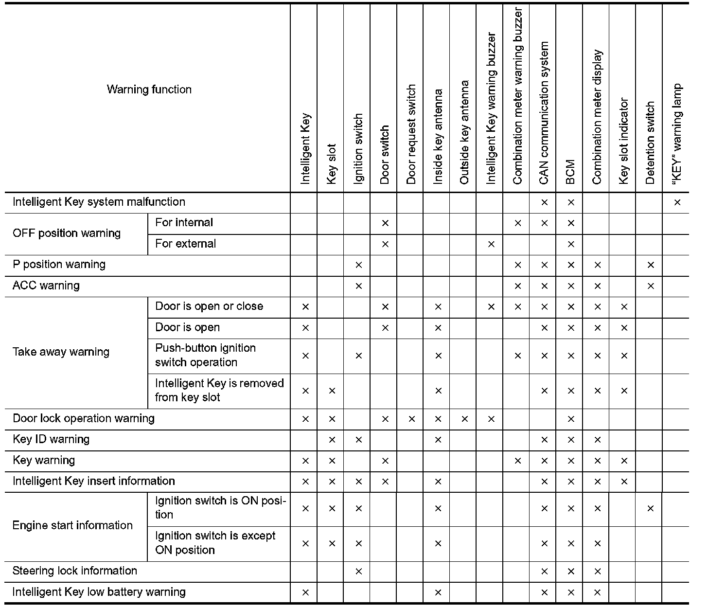 The warning function are as per the following items and are given to the user as warning information and warnings using combinations of Intelligent Key warning buzzer, combination meter buzzer, KEY warning lamp, key slot indicator and information display in combination meter.