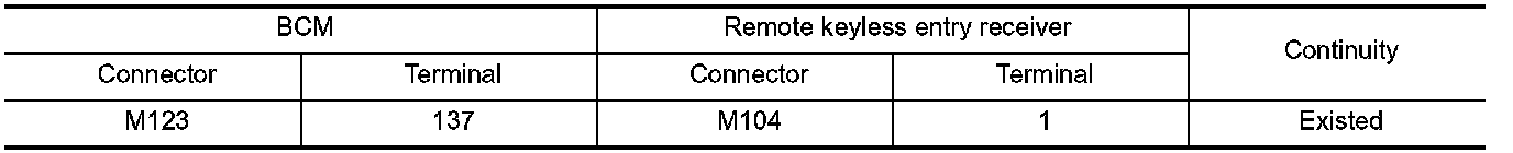 2.Check continuity between BCM harness connector and remote keyless entry receiver harness connector.