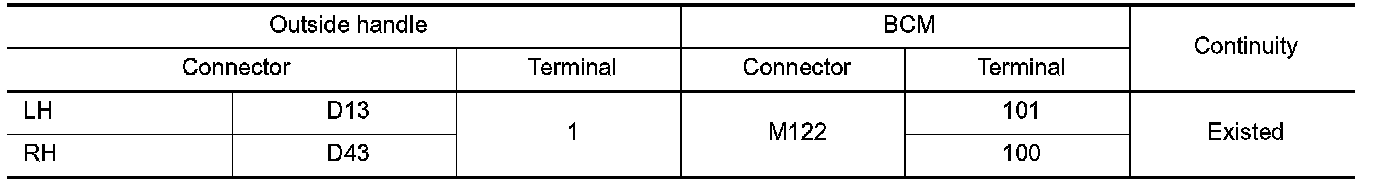 2.Check continuity between malfunctioning outside handle harness connector and BCM harness connector.