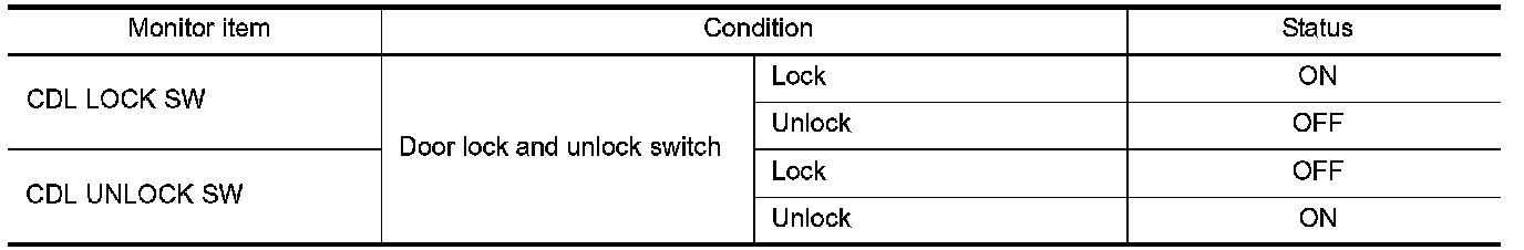 Check ("CDL LOCK SW ", "CDL UNLOCK SW") in BCM "Data Monitor" mode using CONSULT-III.