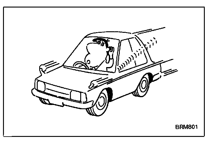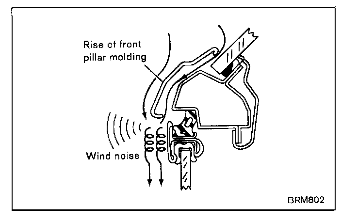 When the wind hits a projection, an eddy or swirl is produced behind the object creating a noise (the principle of flute and bugle sounds). The parts having projections include drip molding, pillar molding, waist molding, hood, wiper, outside mirrors and antenna. The parts having unevenness include pillar molding and front door glass.
