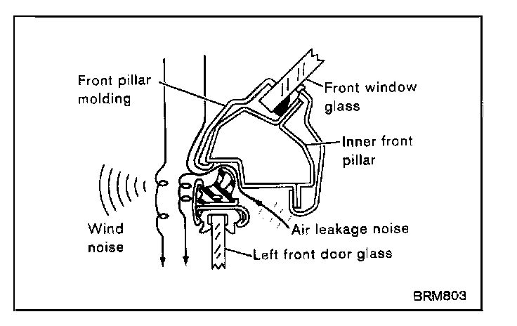 Wind noise and air leakage noise are high frequency noises heard while driving. They are heard mainly from around the door when the window is closed.