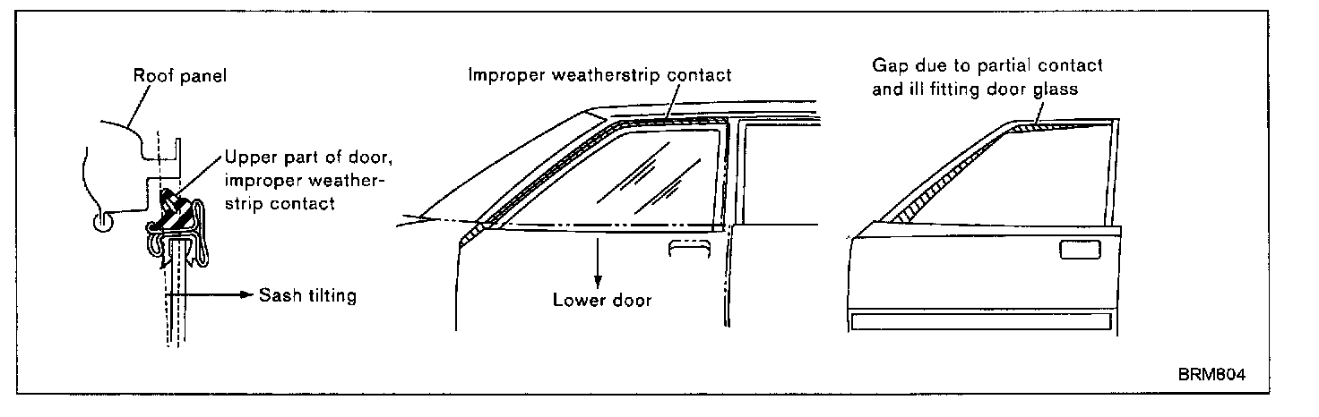 Parts often causing (1) and (2) are the regions around the front pillar, door sash and door glass.