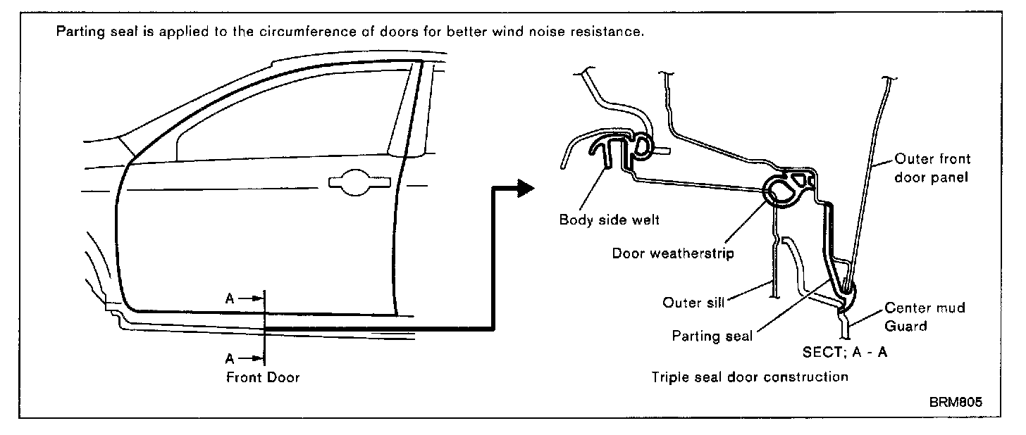 Doors have a triple seal construction that consists of door weatherstrip, body side welt and parting seal. Because of this, anti-noise performance and door closing sound have been improved, and a secure feel when the door is closed has been enhanced.