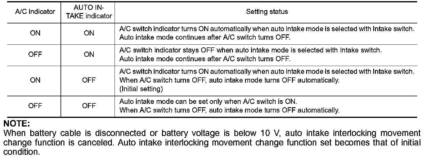 Conditions for interlocking movement of intake switch (auto intake mode) and A/C switch can be changed. In addition, operation of the intake switch, which activates the auto intake control system, can be set to become available when the A/C switch is ON.
