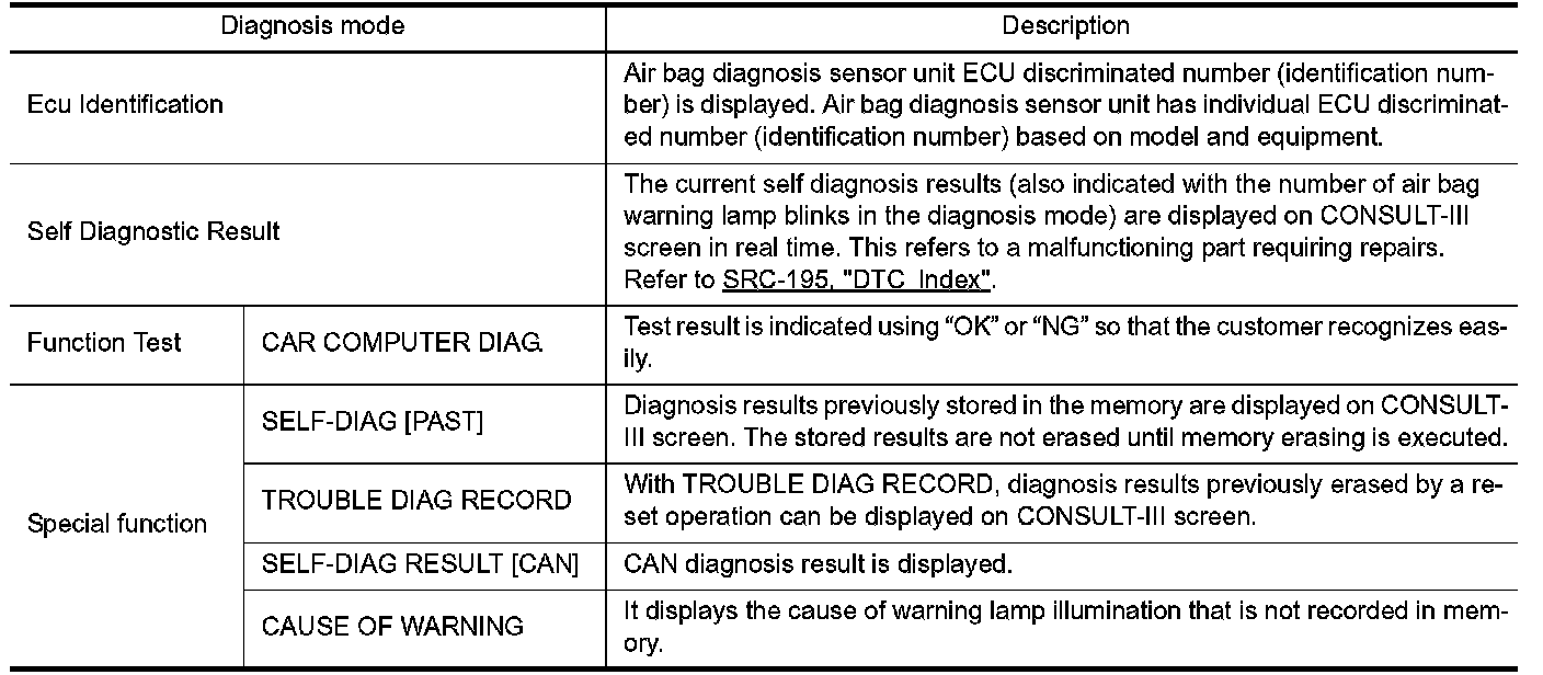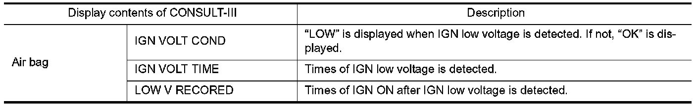 In such a case, the DTC memory is not performed and changing to the self-diagnostic mode by IGN operation cannot be performed while the air bag warning lamp illuminates. "NO DTC" is displayed even if the malfunctioning parts are checked by CONSULT-III.