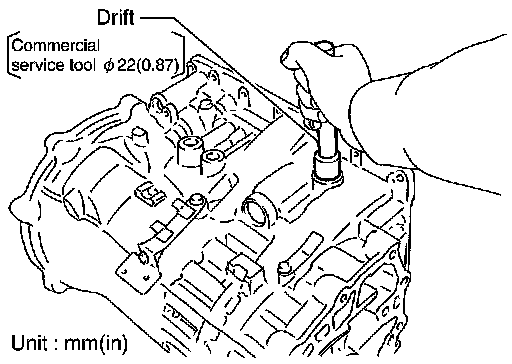 1.As shown in the figure, use a drift [22 mm (0.87 in) dia. commercial service tool] to drive manual shaft oil seals into the transmission case until it is flush.